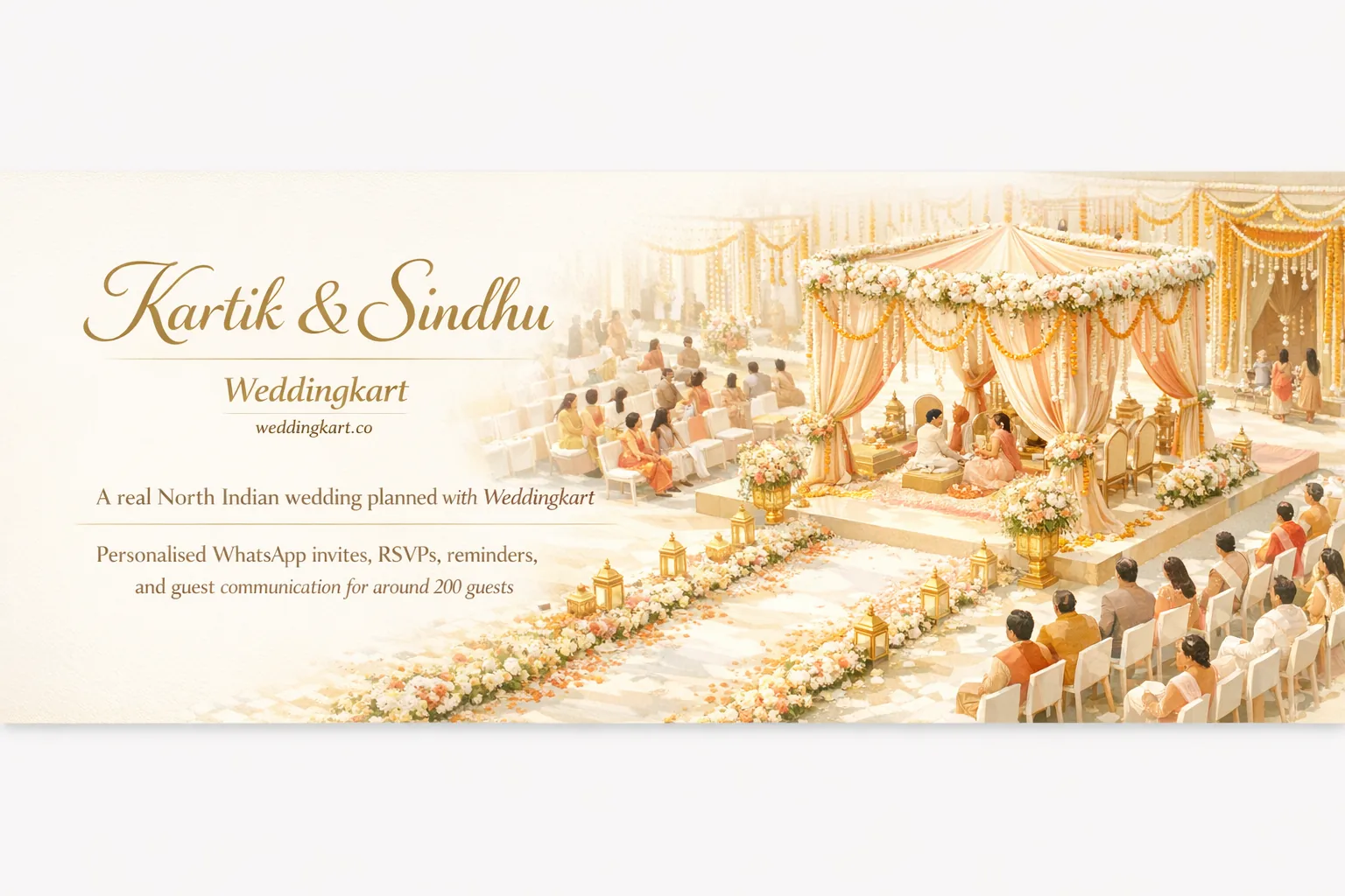 Kartik & Sindhu's December 2024 wedding in India brought together 150-250 guests. Here are all 9 WhatsApp messages their family used — from the save-the-date to the final reminder — all sent through Weddingkart.