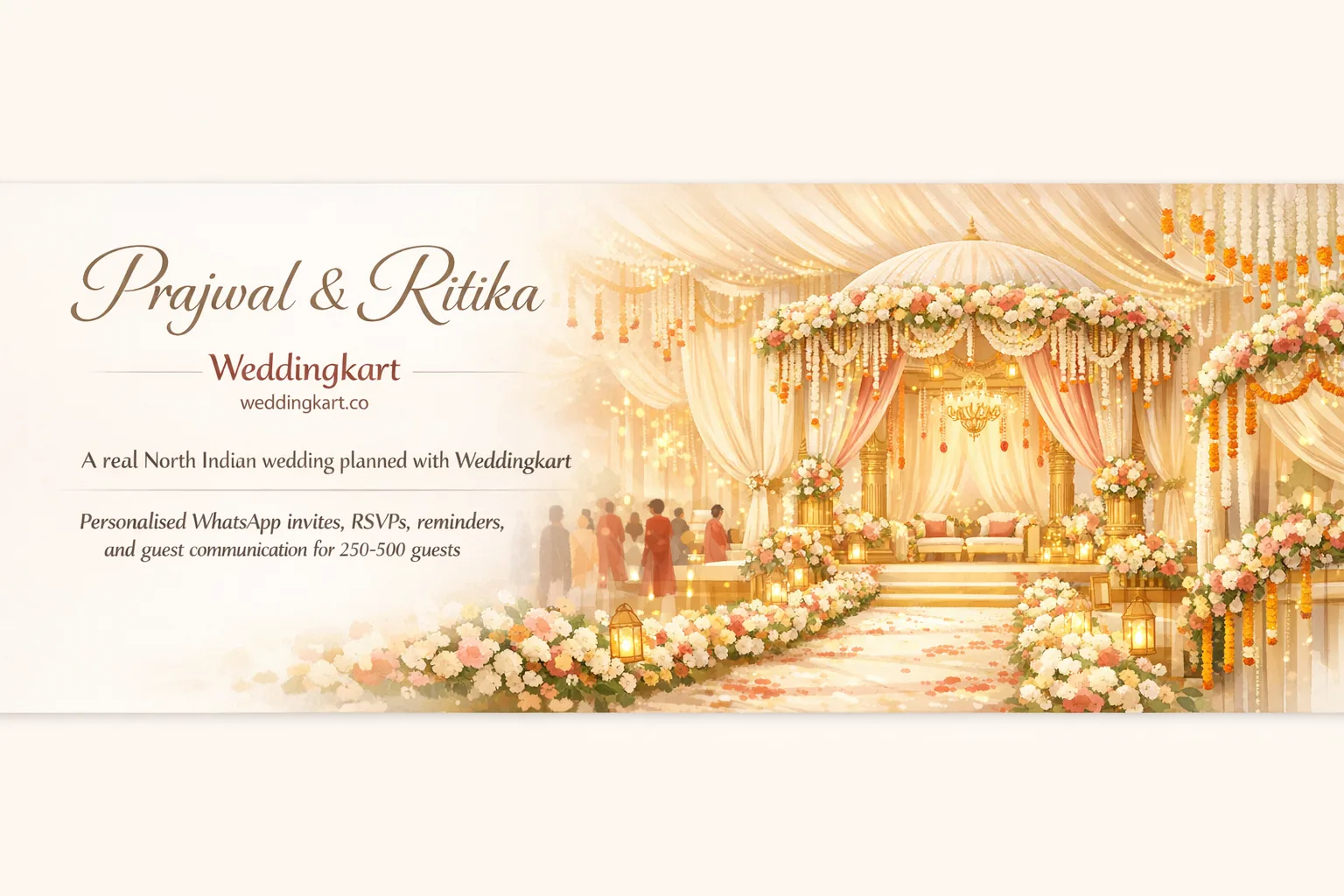 Prajwal & Ritika's February 2026 wedding in India brought together 250-500 guests. Here are all 13 WhatsApp messages their family used — from the save-the-date to the final reminder — all sent through Weddingkart.