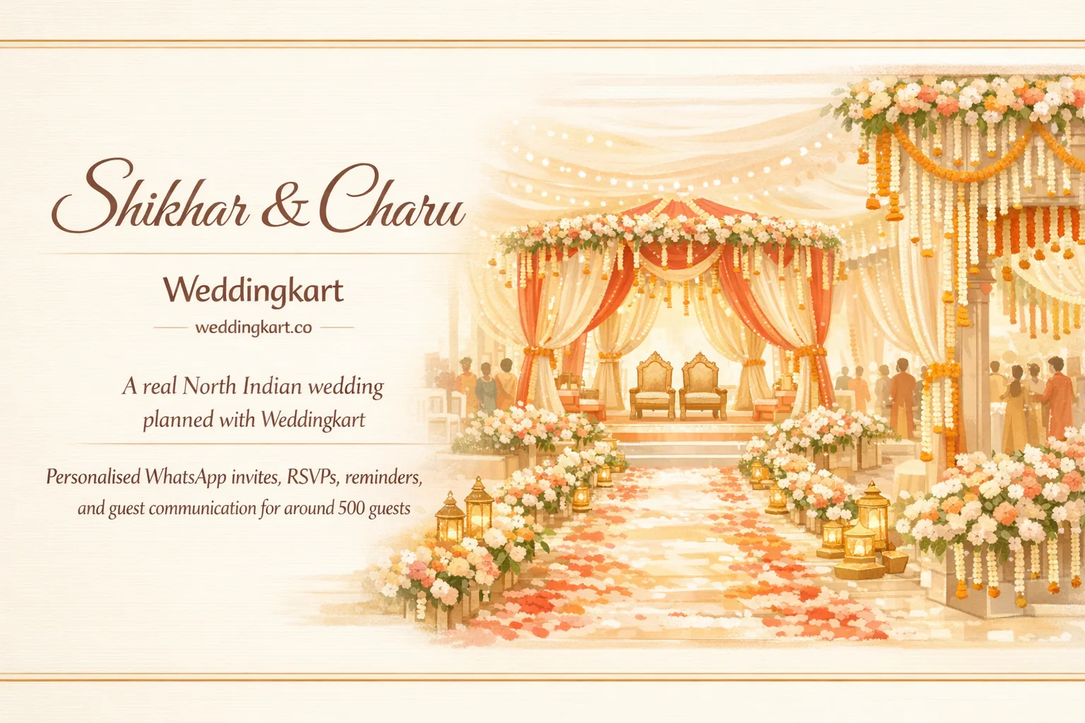Shikhar & Charu's February 2026 wedding in India brought together 250-500 guests. Here are all 8 WhatsApp messages their family used — from the save-the-date to the final reminder — all sent through Weddingkart.