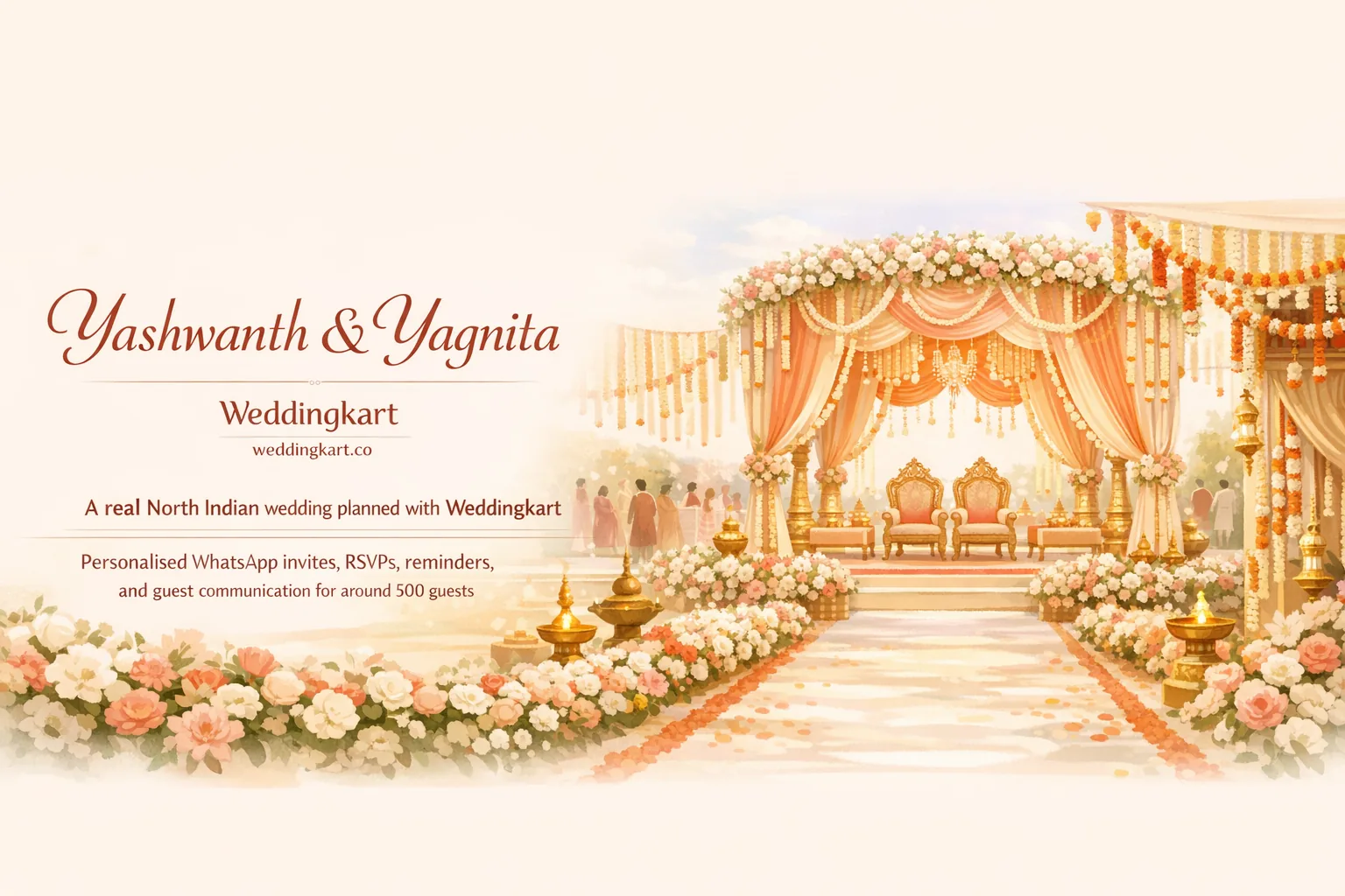 With over 400 guests spread across India and abroad, coordinating everything through phone calls and group chats felt impossible. That's when they found Weddingkart. Within a week, they had sent personalised WhatsApp invitations to every guest — each message tailored to the specific ceremony, complete with timings, venue details, and dress code.